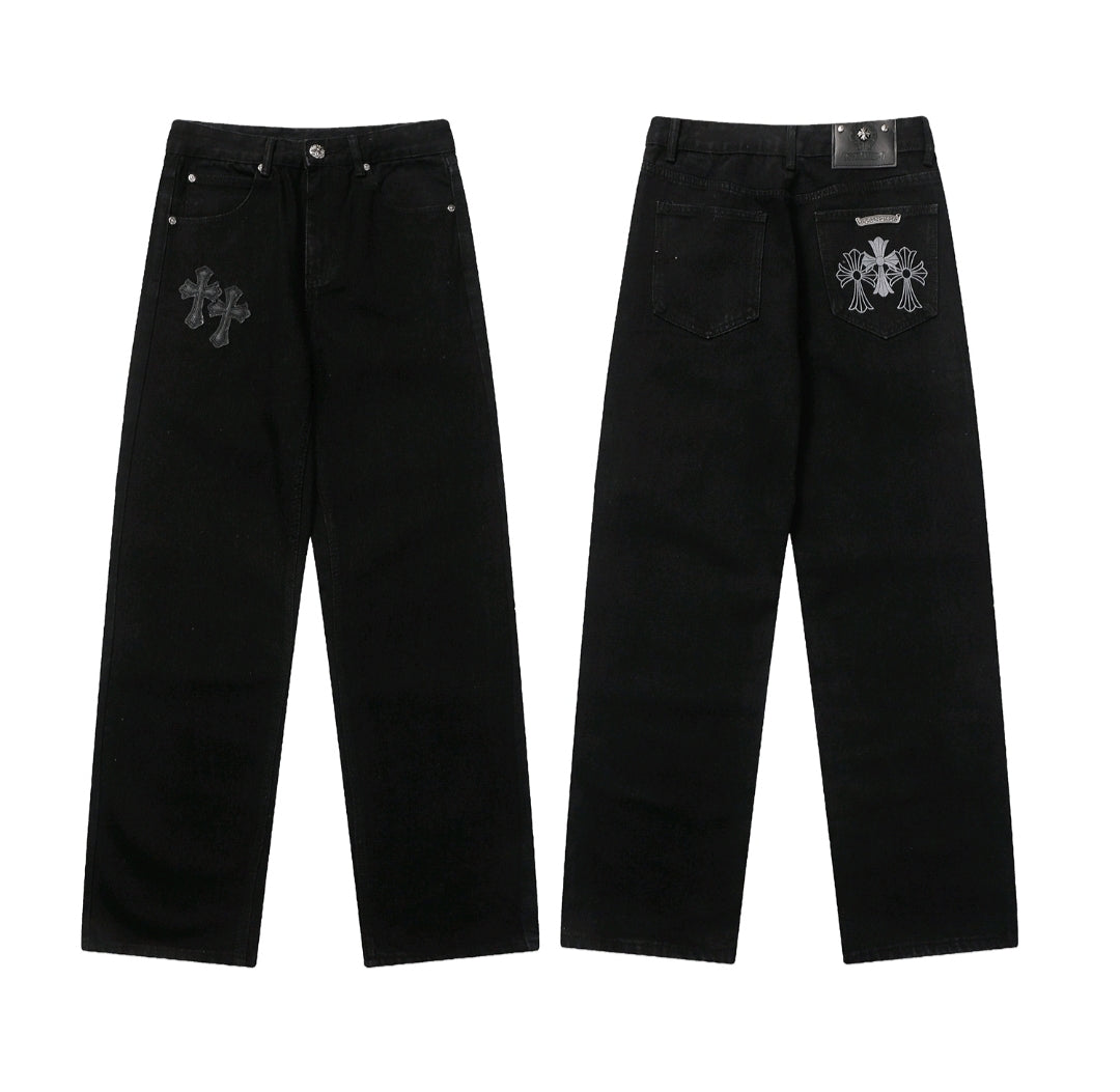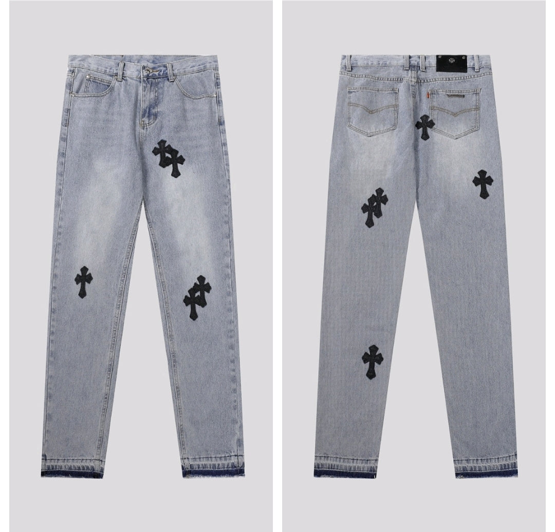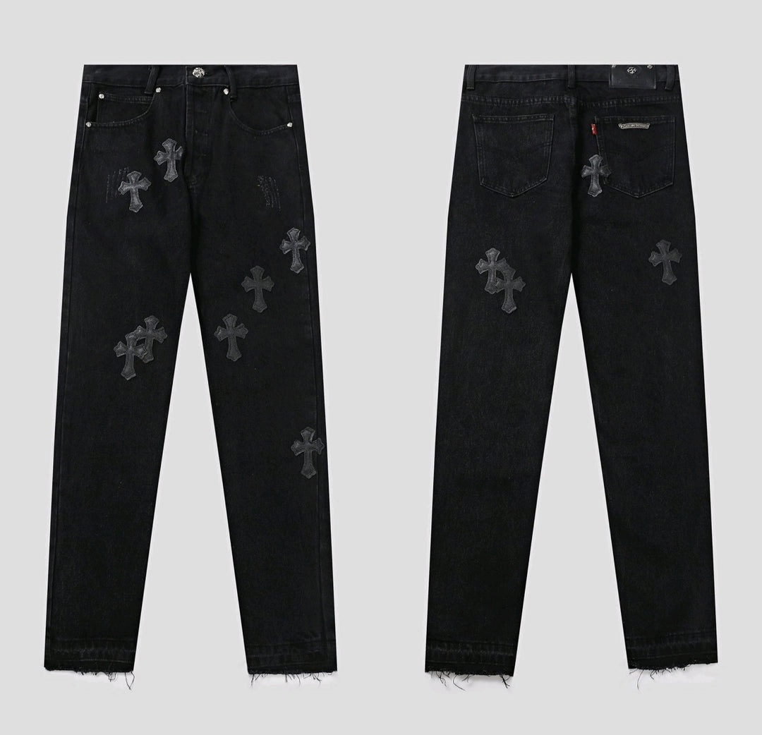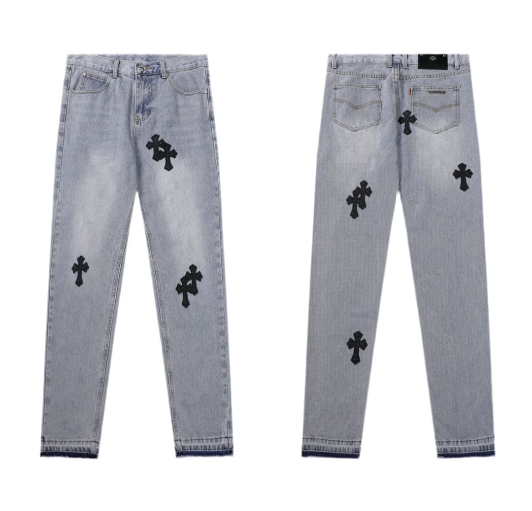 Not your average jeans. The Chrome Hearts Denim is for the bold, the different, the ones who don’t follow trends — they make them. Crafted with heavy-duty denim and iced out in signature CH cross patches, these jeans scream luxury rocker vibes with a street twist.