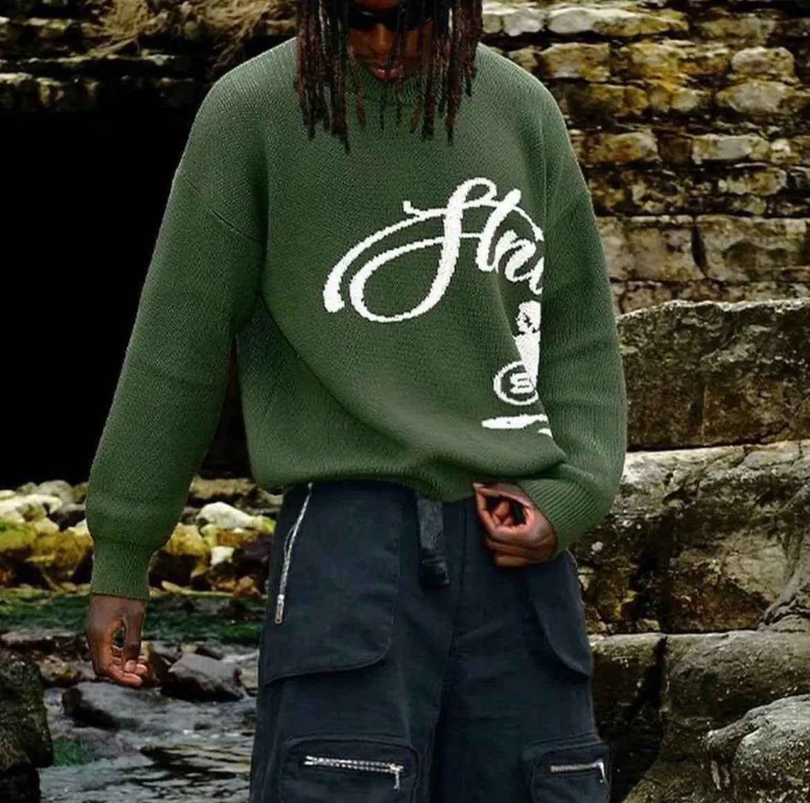 The Men’s Y2K Oversized Knit Sweater showcases a crew neck and striking geometric jacquard design, tailored for a modern streetwear vibe. Its generous fit maximizes comfort, making it ideal for cooler climates. This adaptable garment effortlessly coordinates with jeans or cargo pants, providing a seamless styling solution for relaxed ensembles.